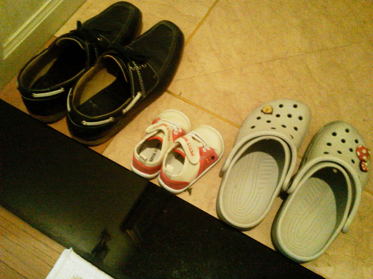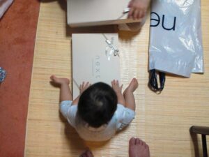 我が家 FAMILY 2011.09.02 なんだかんだで、今日やっと家族四人、我が家で過ごす初めてのよるです。名前を呼んだら手を挙げてお返事する娘の写真がとれました。左手にはリモコン。 「どのチャンネルみたいの?」 クロネコシルエット。 むすこくん。 お祝い頂きました。 むすこくんはまだ靴はないので。 娘の靴がとても小さいことに心がにやけるのはなぜ?